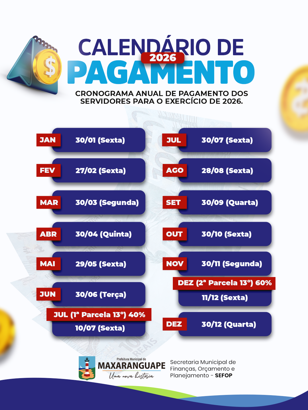 A Prefeitura de Maxaranguape dá um importante passo em favor da organização, da transparência e da valorização do servidor público ao divulgar, pela primeira vez, o Calendário de Pagamentos dos Servidores para o ano de 2026.