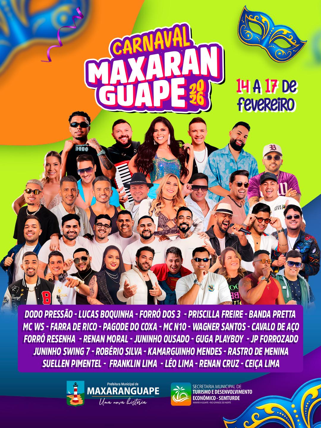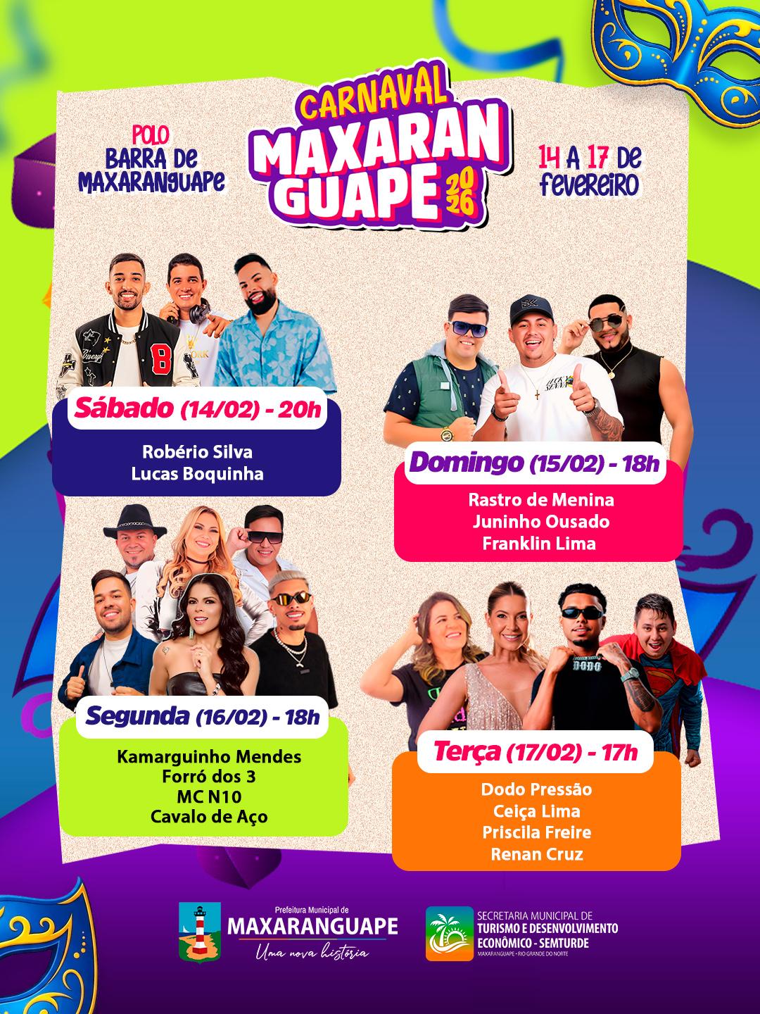 A Prefeitura de Maxaranguape apresenta a programação oficial do Carnaval 2026, uma das festas mais aguardadas do ano, que promete levar alegria, música e animação a todo o município.