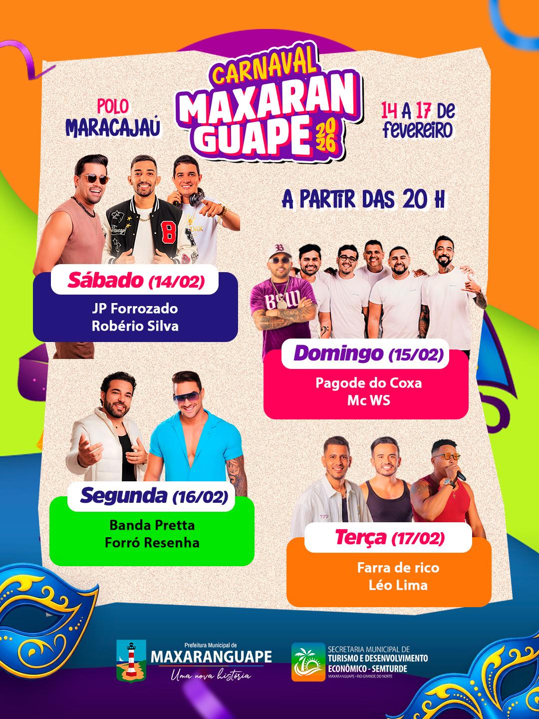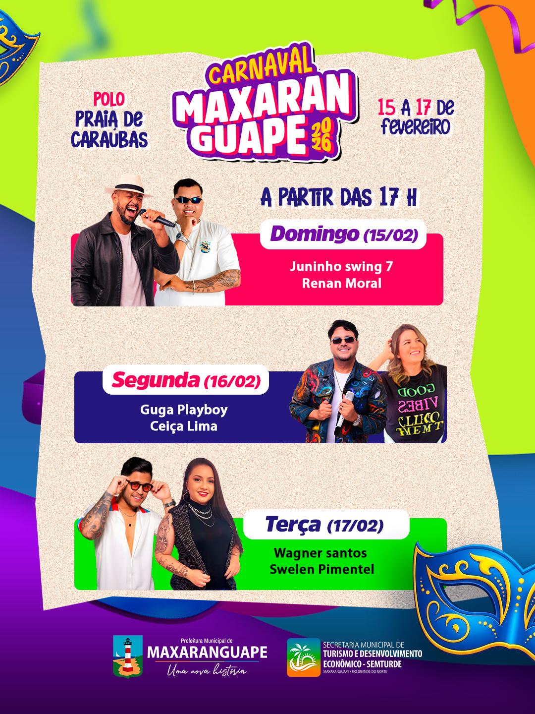 A folia acontece de 14 a 17 de fevereiro, com atrações distribuídas em três polos: Barra de Maxaranguape, Praia de Caraúbas e Maracajaú, garantindo diversão, integração e opções para públicos de todas as idades.